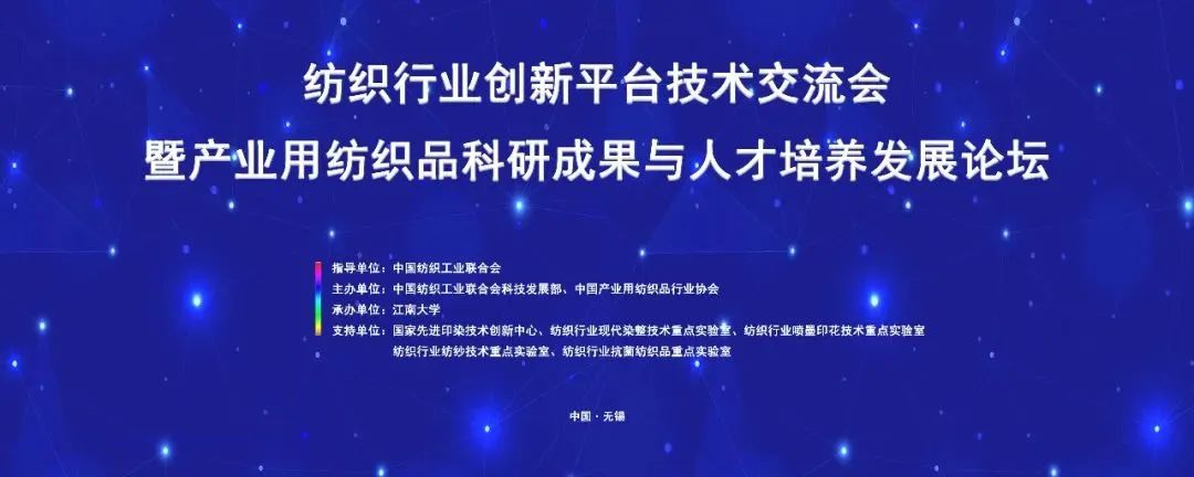 本次活动由中国纺织工业联合会科技发展部、中国产业用纺织品行业协会主办,江南大学承办,国家先进印染技术创新中心、纺织行业现代染整技术重点实验室、纺织行业喷墨印花技术重点实验室、纺织行业纺纱技术重点实验室、纺织行业抗菌纺织品重点实验室支持。