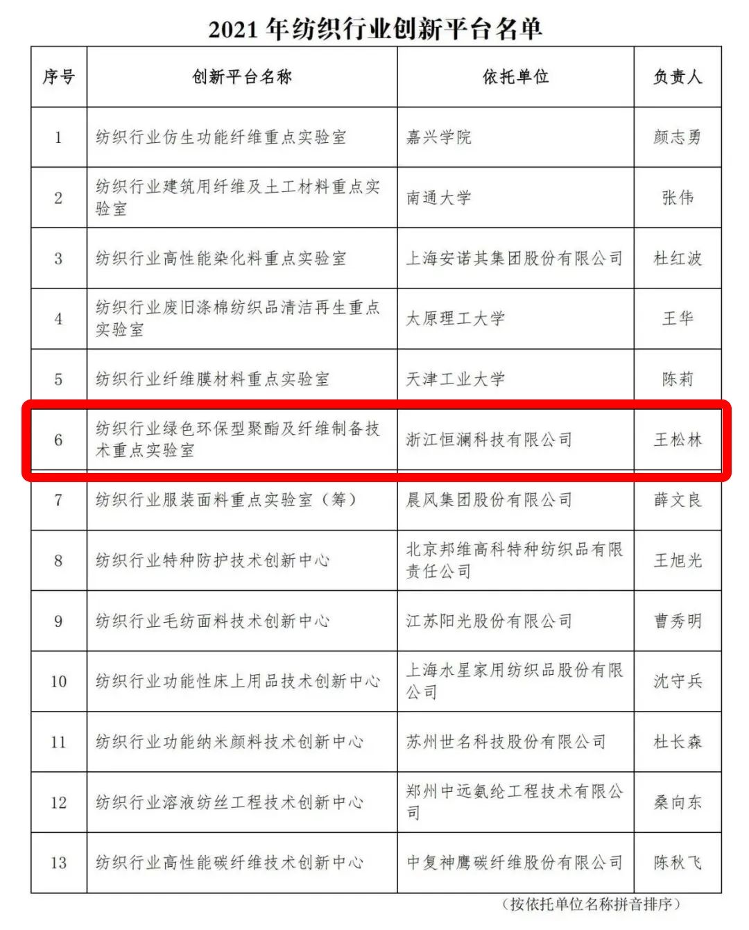 近日,“纺织行业创新平台技术交流会暨产业用纺织品科研成果与人才培养发展论坛”在无锡举行。恒逸研究院(原浙江恒澜科技有限公司)“纺织行业绿色环保型聚酯及纤维制备技术重点实验室”入选2021年纺织行业创新平台名单并获授牌。