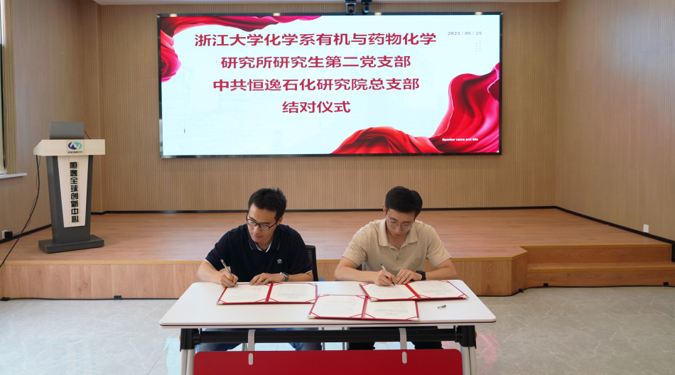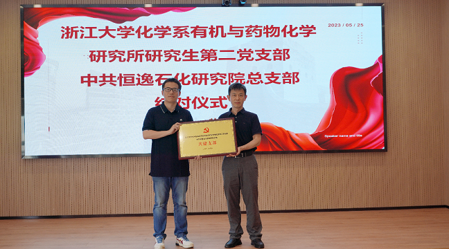 5月25日,浙江大学化学系有机与药物化学研究所研究生第二党支部和中共恒逸石化研究院总支部在恒逸研究院举行结对仪式,强化落实产教融合、校企合作以及党建交流。