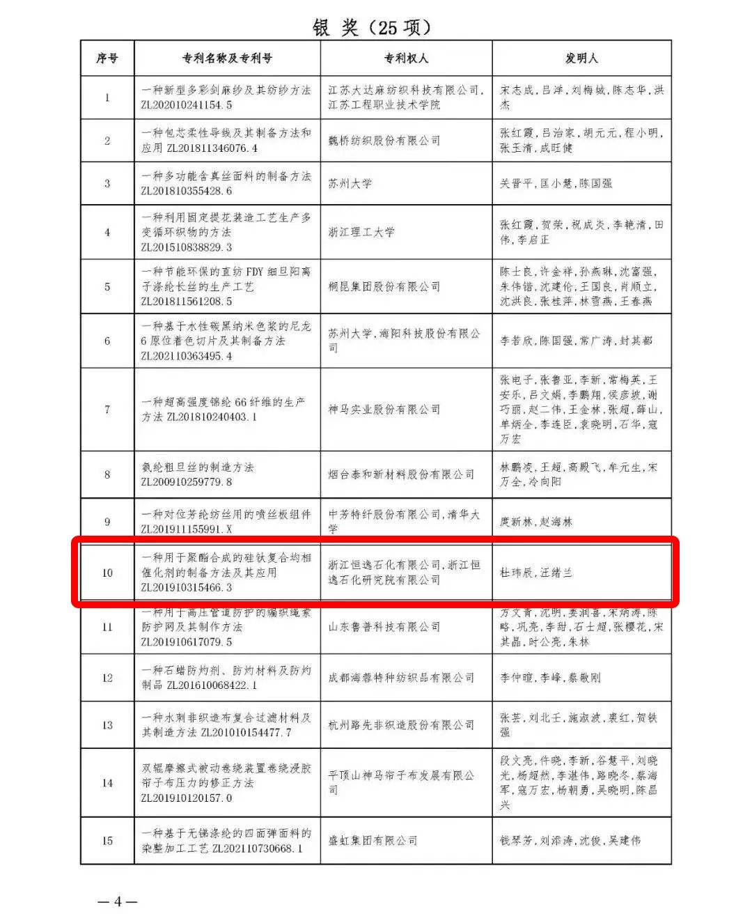 日前,中国纺织工业联合会发布2022年度中国纺织工业联合会优秀专利。浙江恒逸石化有限公司、浙江恒逸石化研究院有限公司研发申请的无锑环保聚酯逸泰康核心技术专利——“一种用于聚酯合成的硅钛复合均相催化剂的制备方法及其应用,被授予中国纺织工业联合会优秀专利银奖。