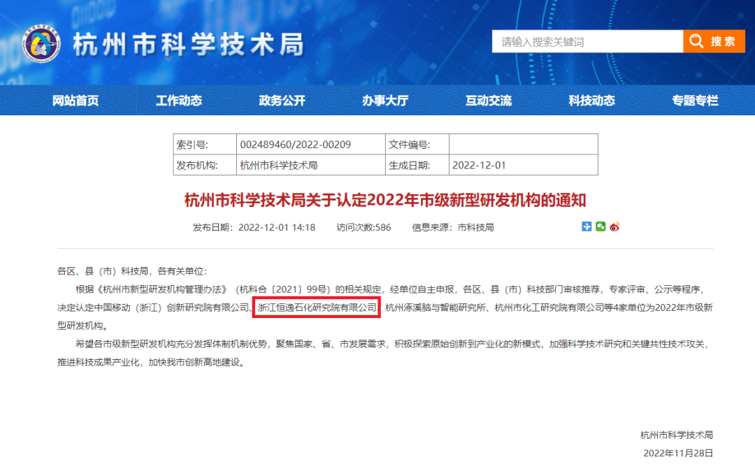 近日,杭州市科学技术局印发了《杭州市科学技术局关于认定2022年市级新型研发机构的通知》,浙江恒逸石化研究院有限公司(简称恒逸研究院)榜上有名,成为首批市级新型研发机构。