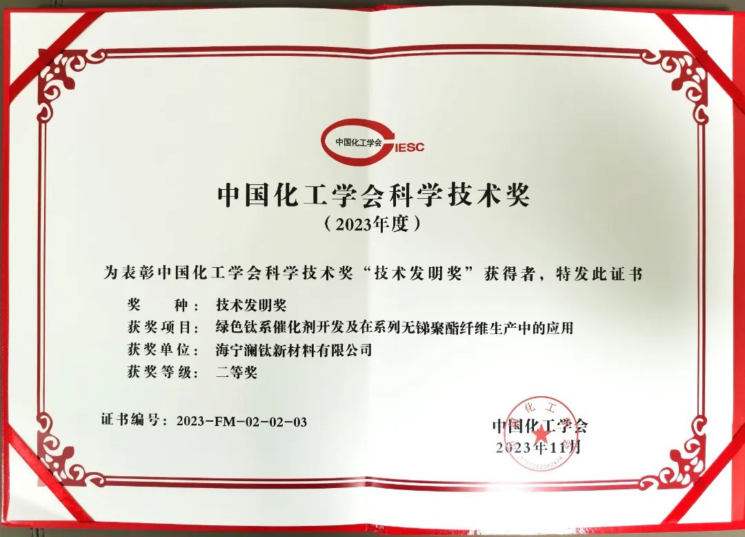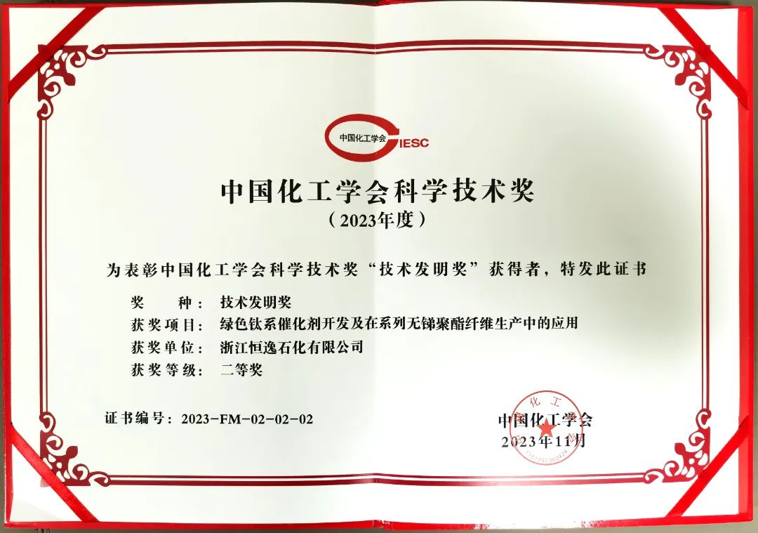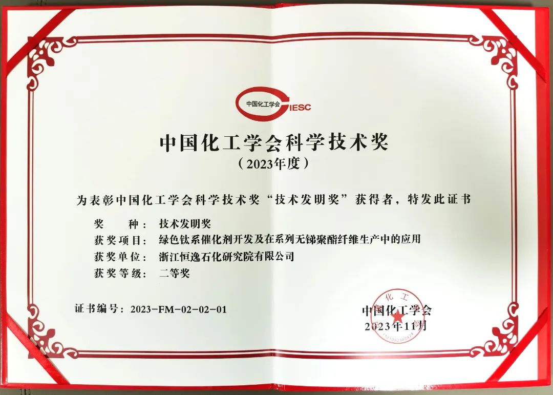 2023年度中国化工学会科学技术奖颁奖仪式于11月28日在广州举行,恒逸自主研发项目《绿色钛系催化剂开发及在系列无锑聚酯纤维生产中的应用》荣获“技术发明奖”二等奖。