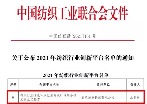 日前,中国纺织工业联合会发布《关于2021年纺织行业创新平台公布名单的通知》,浙江恒澜科技有限公司(恒逸研究院)“纺织行业绿色环保型聚酯及纤维制备技术重点实验室”位列其中。