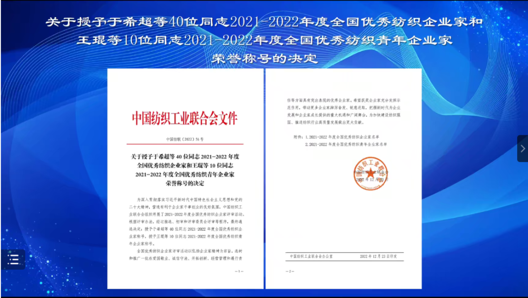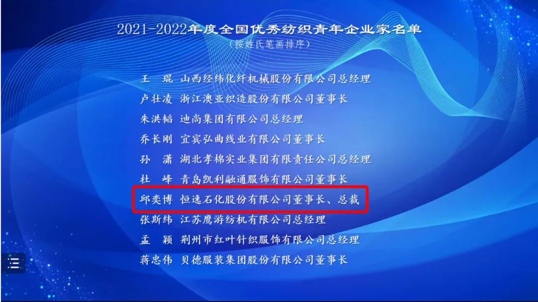 12月29日,2022年中国纺织大会以线上线下的形式在北京举行。会议介绍了2021-2022年度全国优秀纺织企业家、全国优秀纺织青年企业家评审等总体情况。恒逸石化股份有限公司董事长、总裁邱奕博获评全国优秀纺织青年企业家。