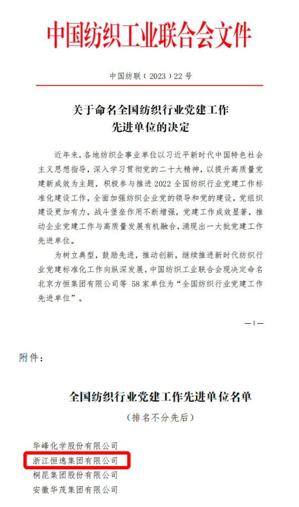 在中国共产党成立102周年之际,中国纺织工业联合会印发《关于命名全国纺织行业党建工作先进单位的决定》(中国纺联〔2023〕22号文件),授予58家单位“全国纺织行业党建工作先进单位”荣誉称号,浙江恒逸集团有限公司榜上有名。