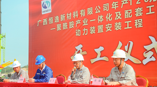 56858分,广西恒逸新材料有限公司年产120万吨己内酰胺聚酰胺产业一体化及配套工程项目动力装置安装工程正式开工。广西恒逸新材料有限公司总经理沈飞等公司领导及迪尔集团有限公司二公司、浙江泰宁建设工程管理咨询有限公司有关领导出席开工仪式。